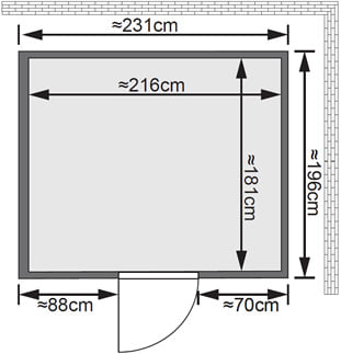 Les deux parois avant et latérales ont un profil en bois interne et externe, chacun d'une épaisseur de pas moins de 13 mm, tandis que la paroi arrière a un profil interne de 13 mm et un externe de 3 mm. En revanche, le plafond a une épaisseur de 57 mm, y compris le panneau isolant en laine de roche et le revêtement intérieur en profil de bois.